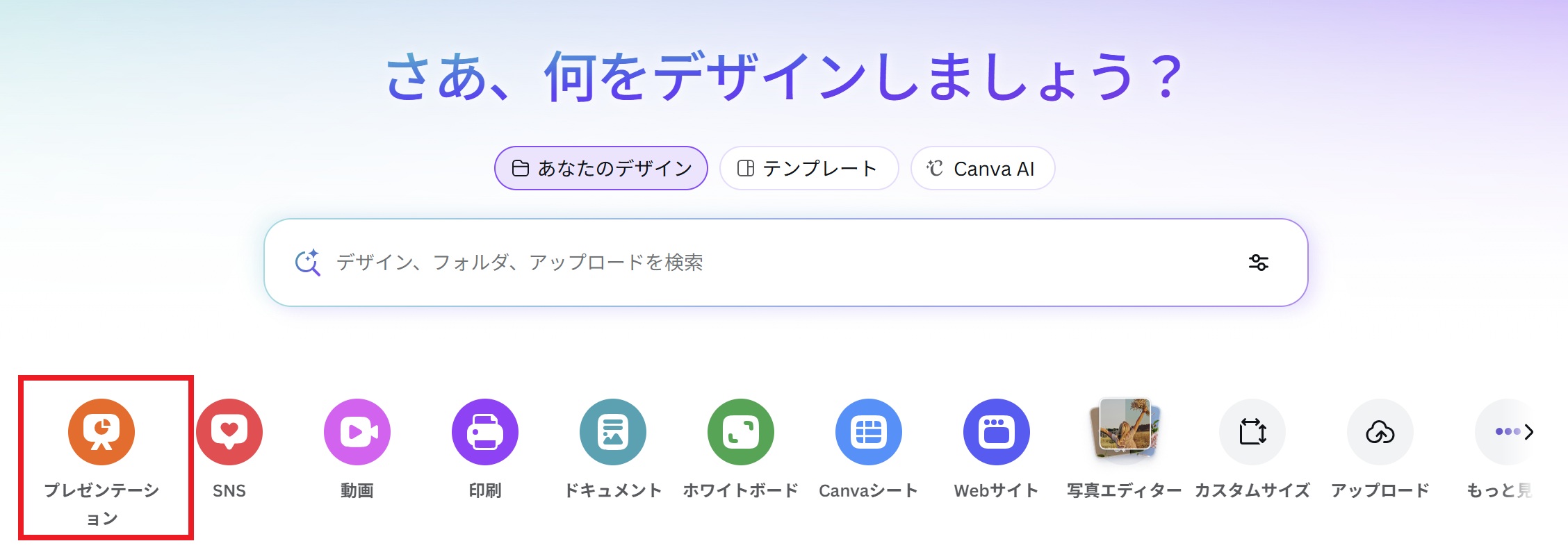 Canvaにログイン後、ホーム画面にて「プレゼンテーション」を選択してください。