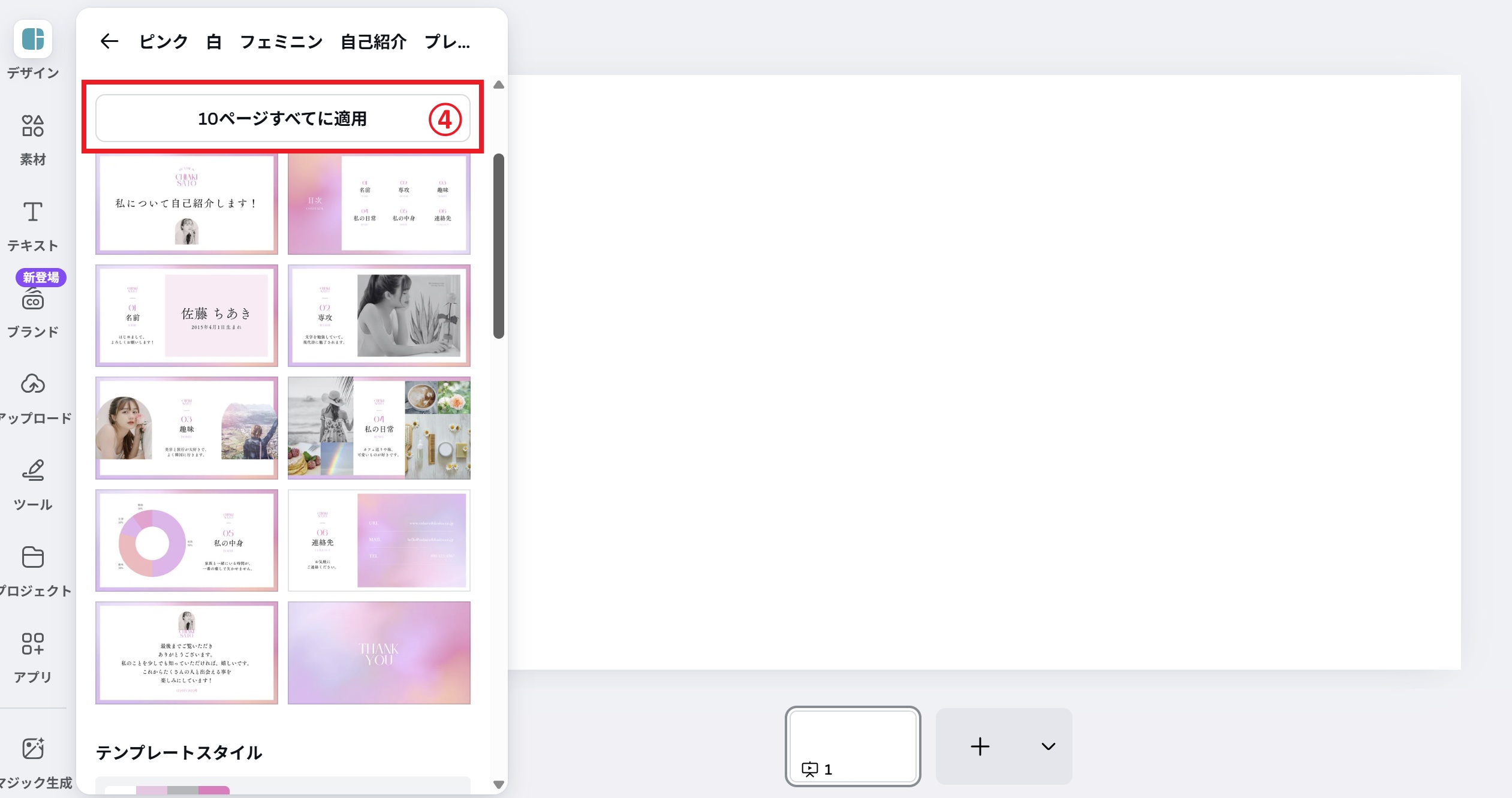 ④各スライドをすべてをキャンパスに反映させる場合は「すべての適応」をクリック