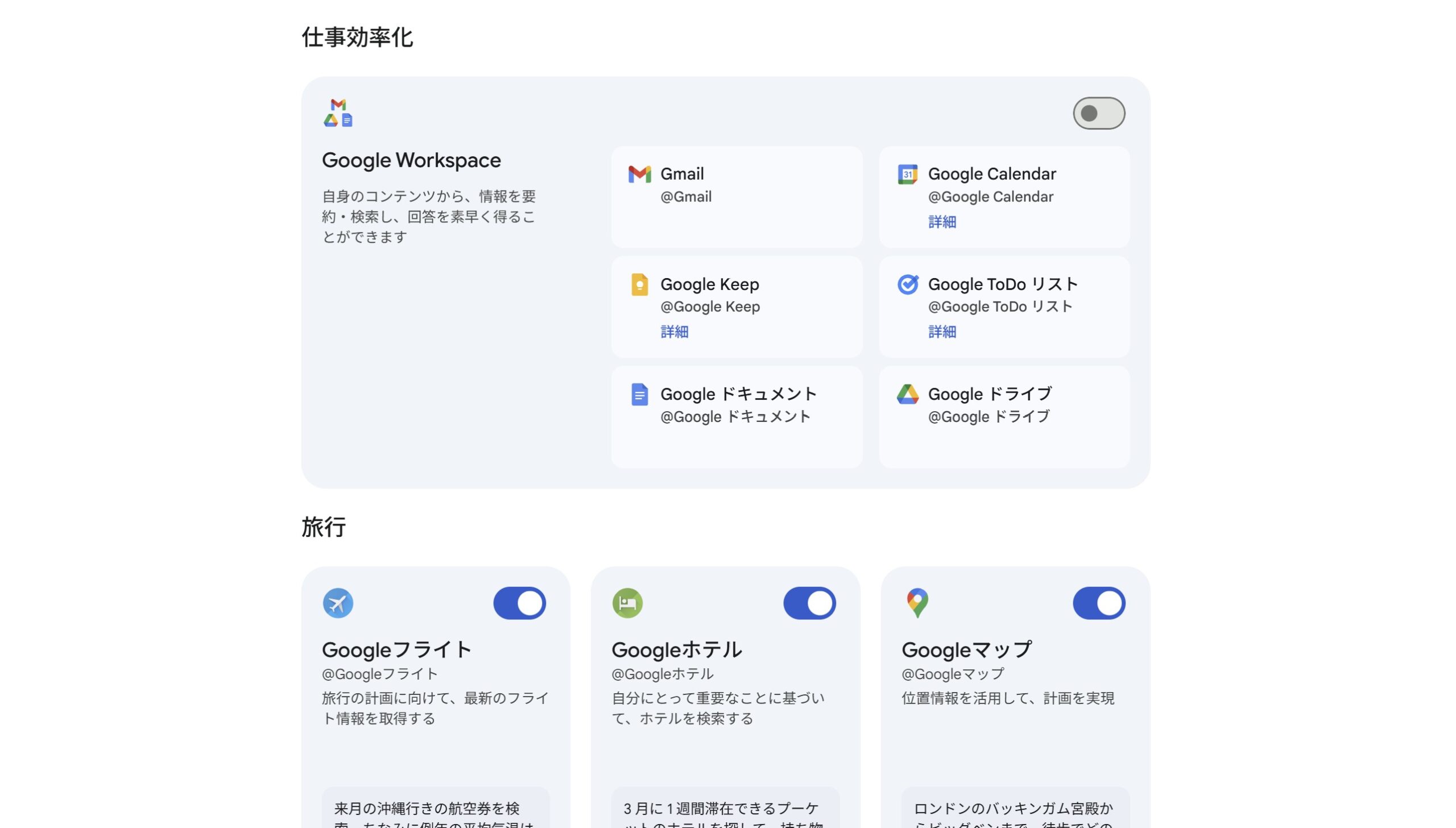 Geminiには、Googleの他のサービス(Google検索、YouTube、Google Workspaceなど)と連携する「拡張機能」があります。これにより、Geminiがより多くの情報にアクセスし、あなたのタスクをサポートできます。