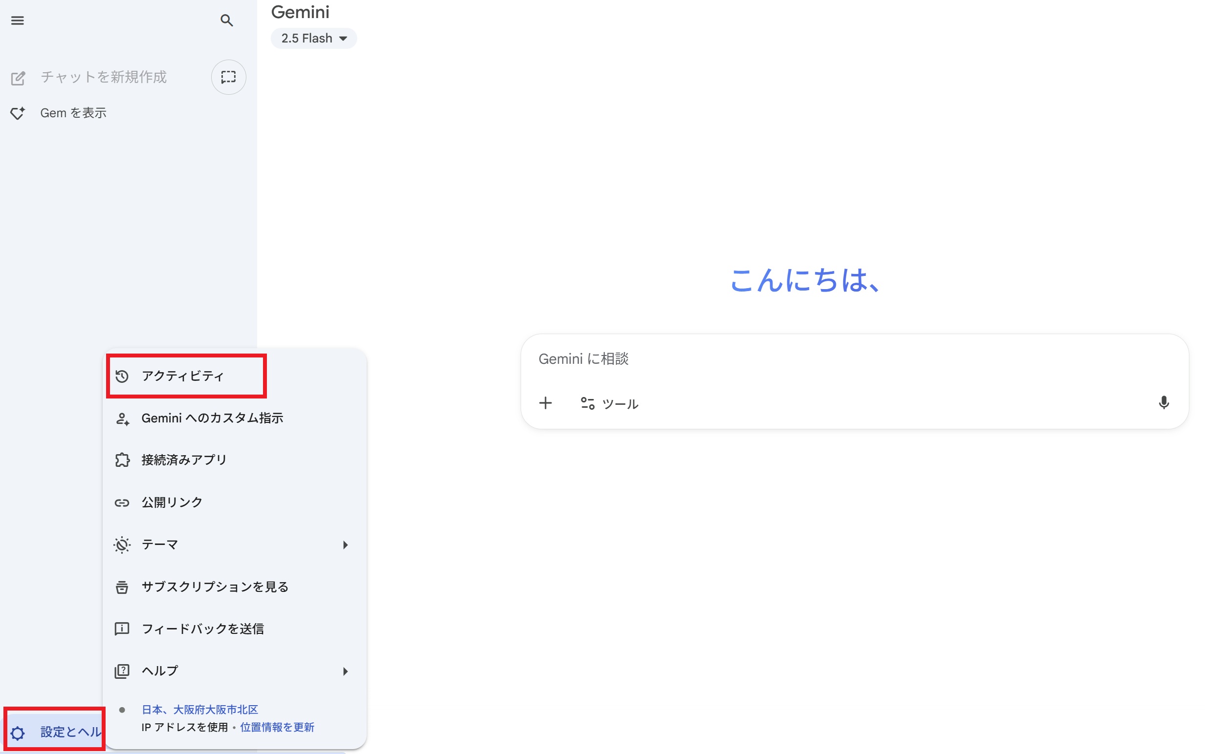 プライバシー設定では、Geminの「アクティビティ」をオフにすることで、会話履歴が保存され、AIの学習に使用されることを防ぐことができます。