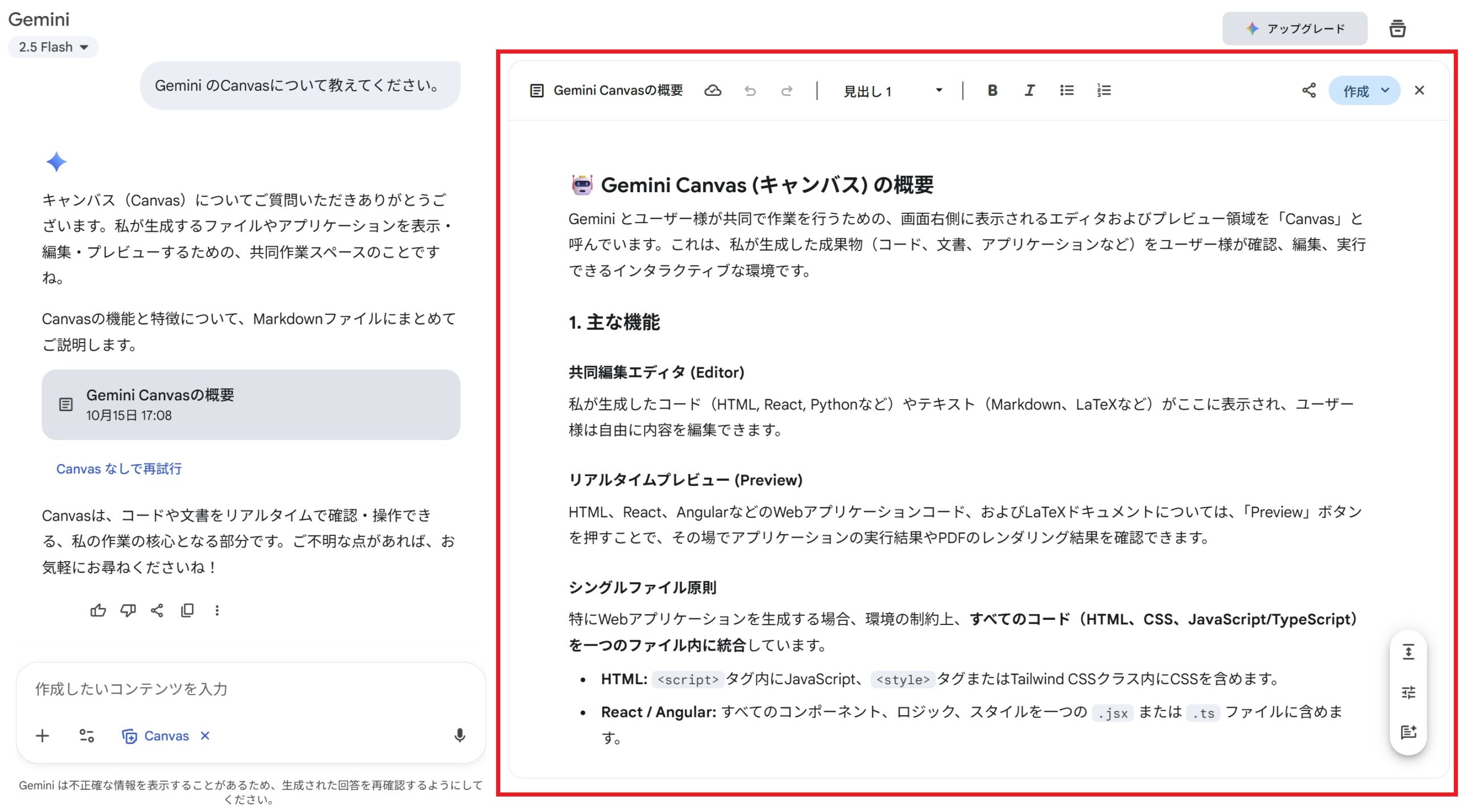 - Gemini が生成したテキスト(レポートの下書き、コード、スピーチ原稿など)を、Canvas 上でまるで Google ドキュメントを操作するかのごとく、直接加筆・修正できます。