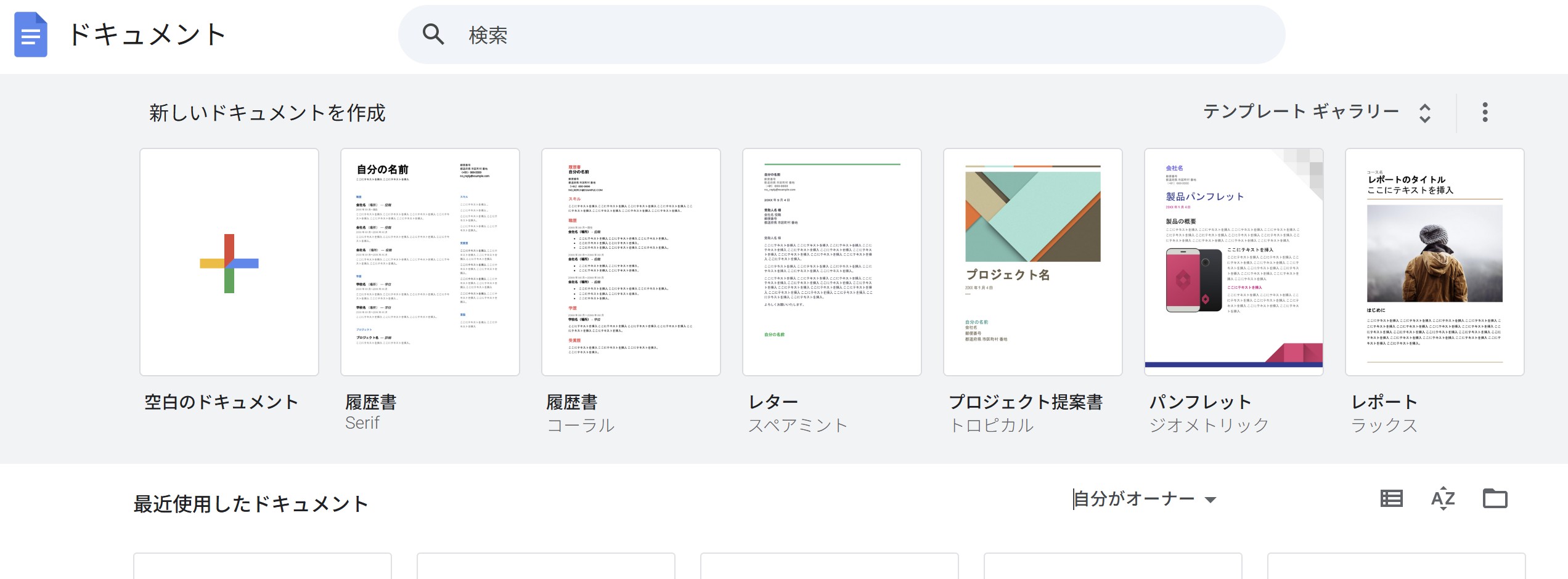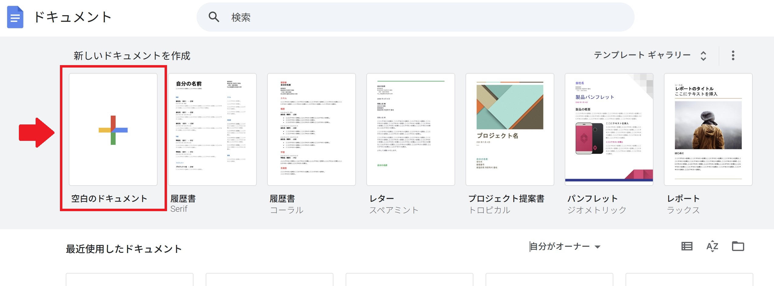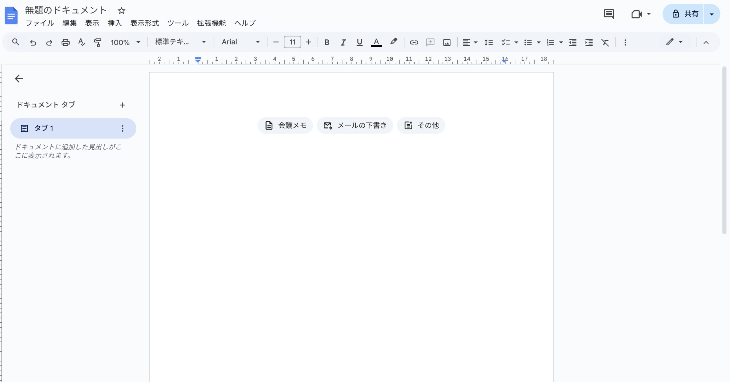 「空白のドキュメント」をクリック → 新しい文書が作成されます。