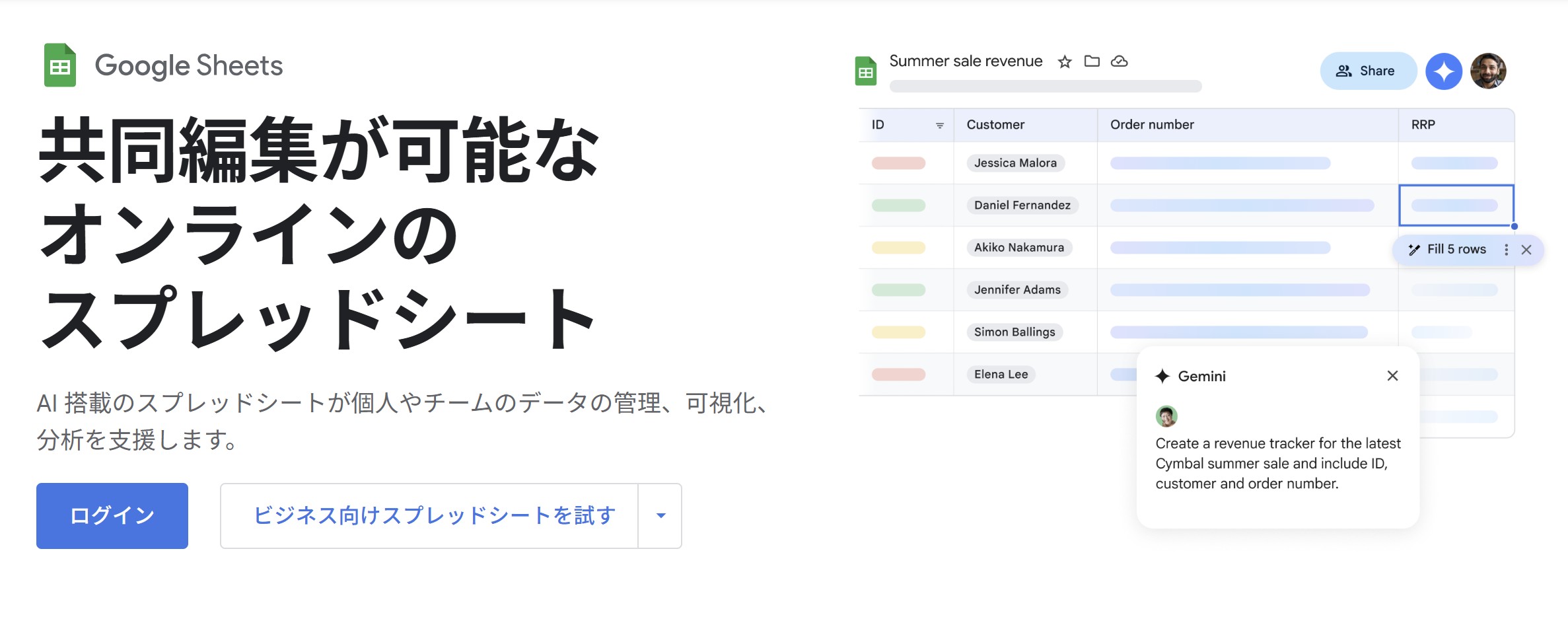 複数人で同じシートを同時に編集可能。コメント機能や履歴管理もあります。