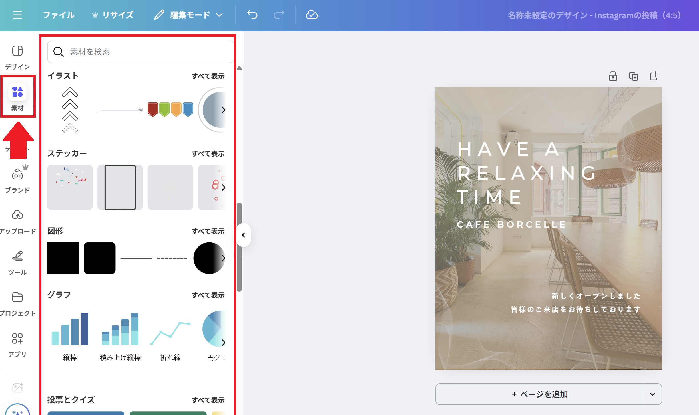 Canvaは図形やイラストなどの「素材」も豊富で、左サイドバーの「素材」から追加可能です。