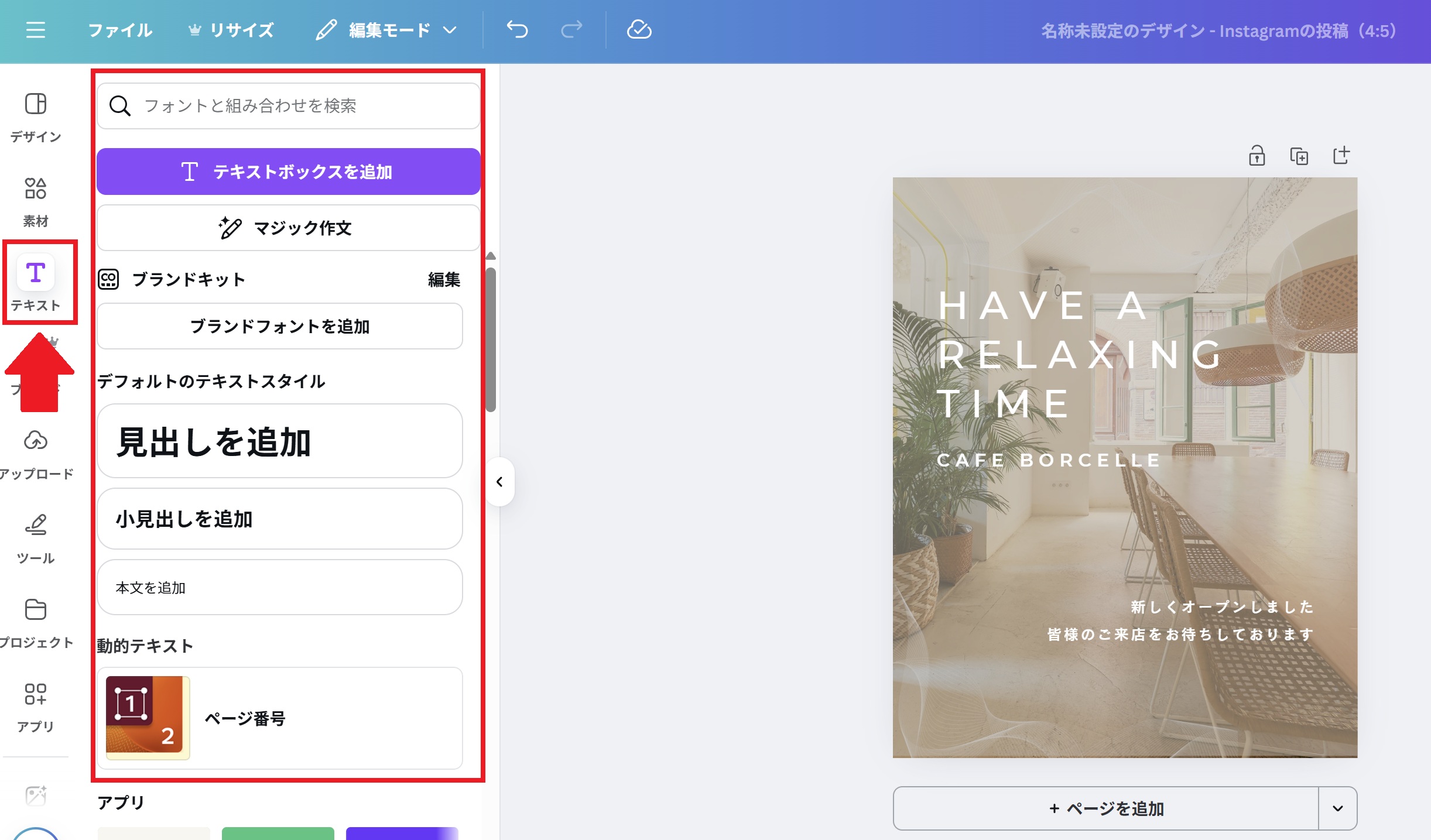 左サイドバーの「テキスト」から「見出しを追加」「本文を追加」