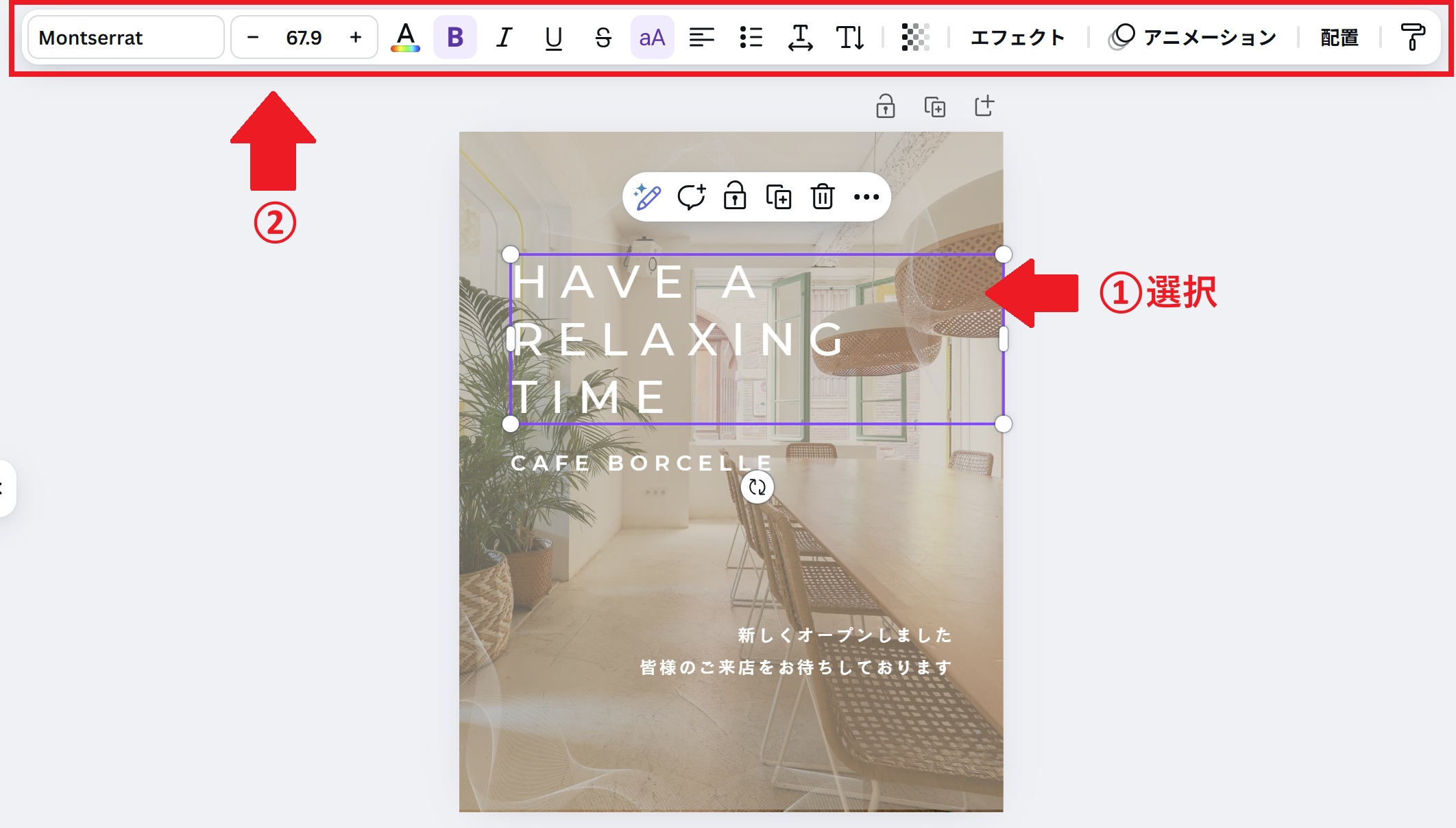 調整したい個所を選択すると、上部にメニューバーが表示されるので、メニューバーから各種の調整が可能です。
