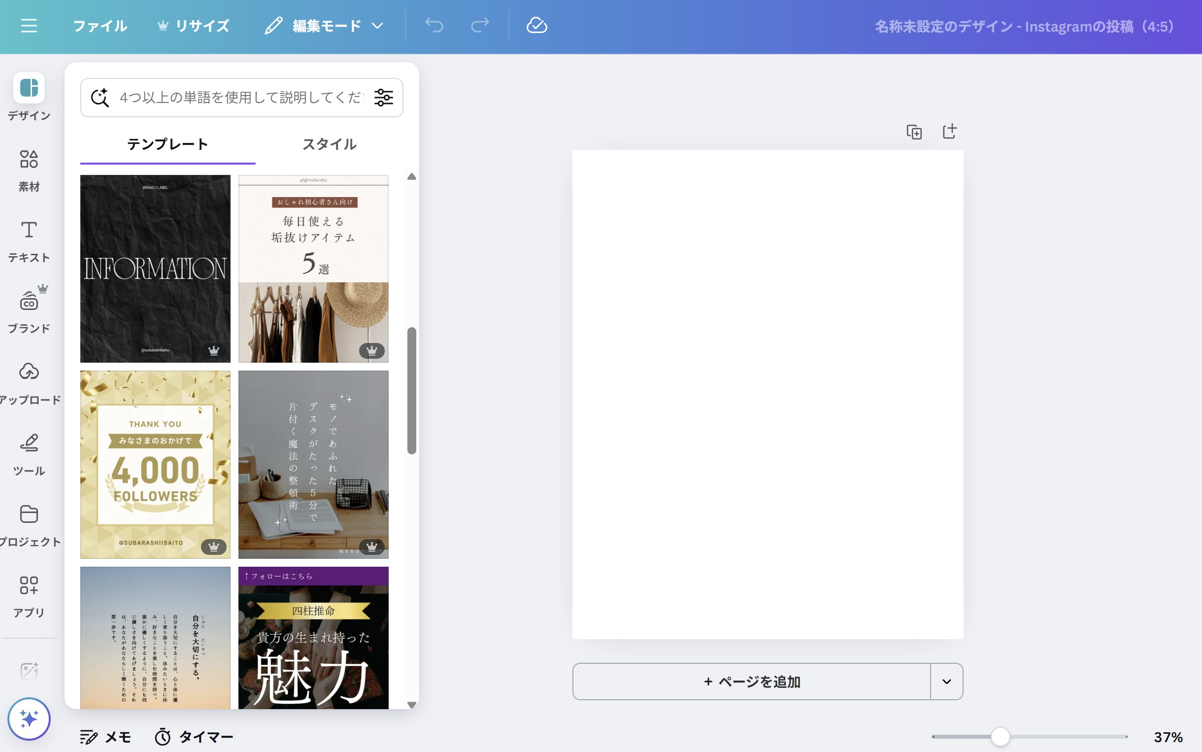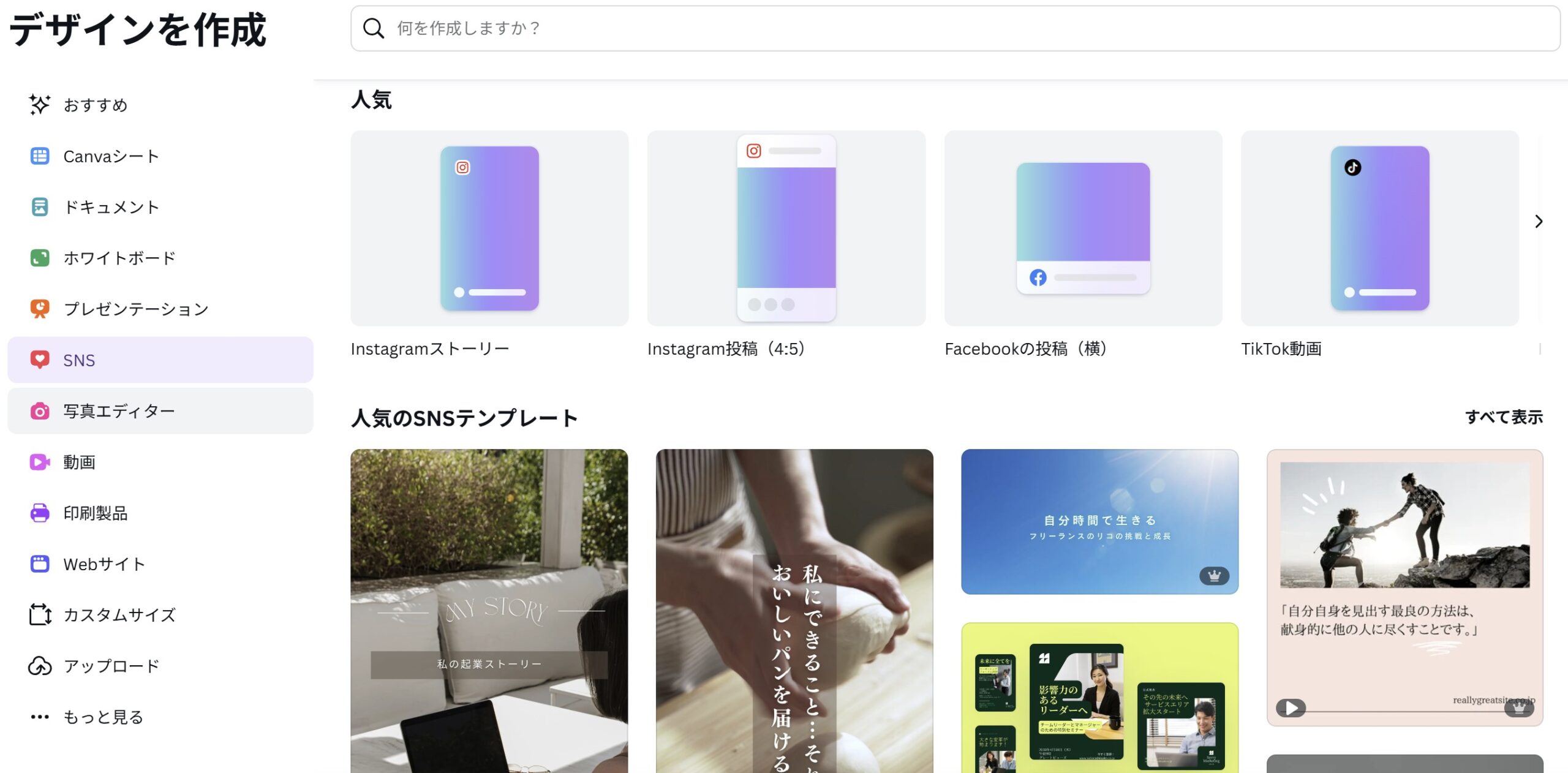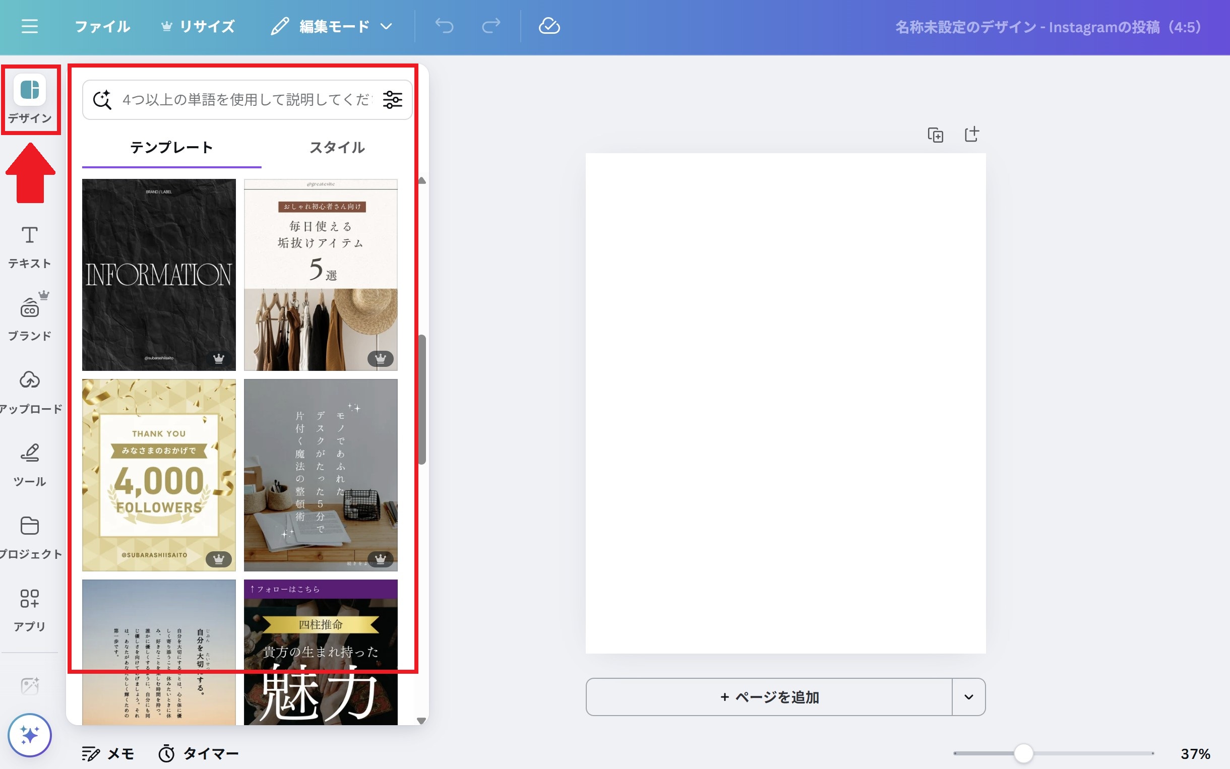 Canvaには豊富なテンプレートが用意されており、左サイドバーの「デザイン」から「テンプレート」を選ぶことが可能です。