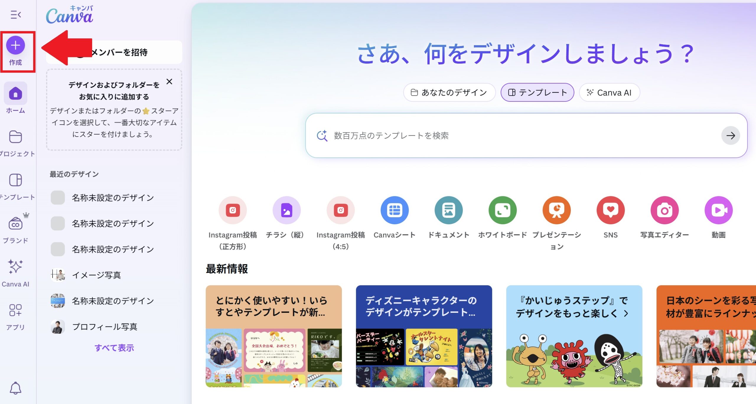左のサイドバーになる「作成」ボタンを押しても、各サイズのキャンバスを選ぶことも可能です。