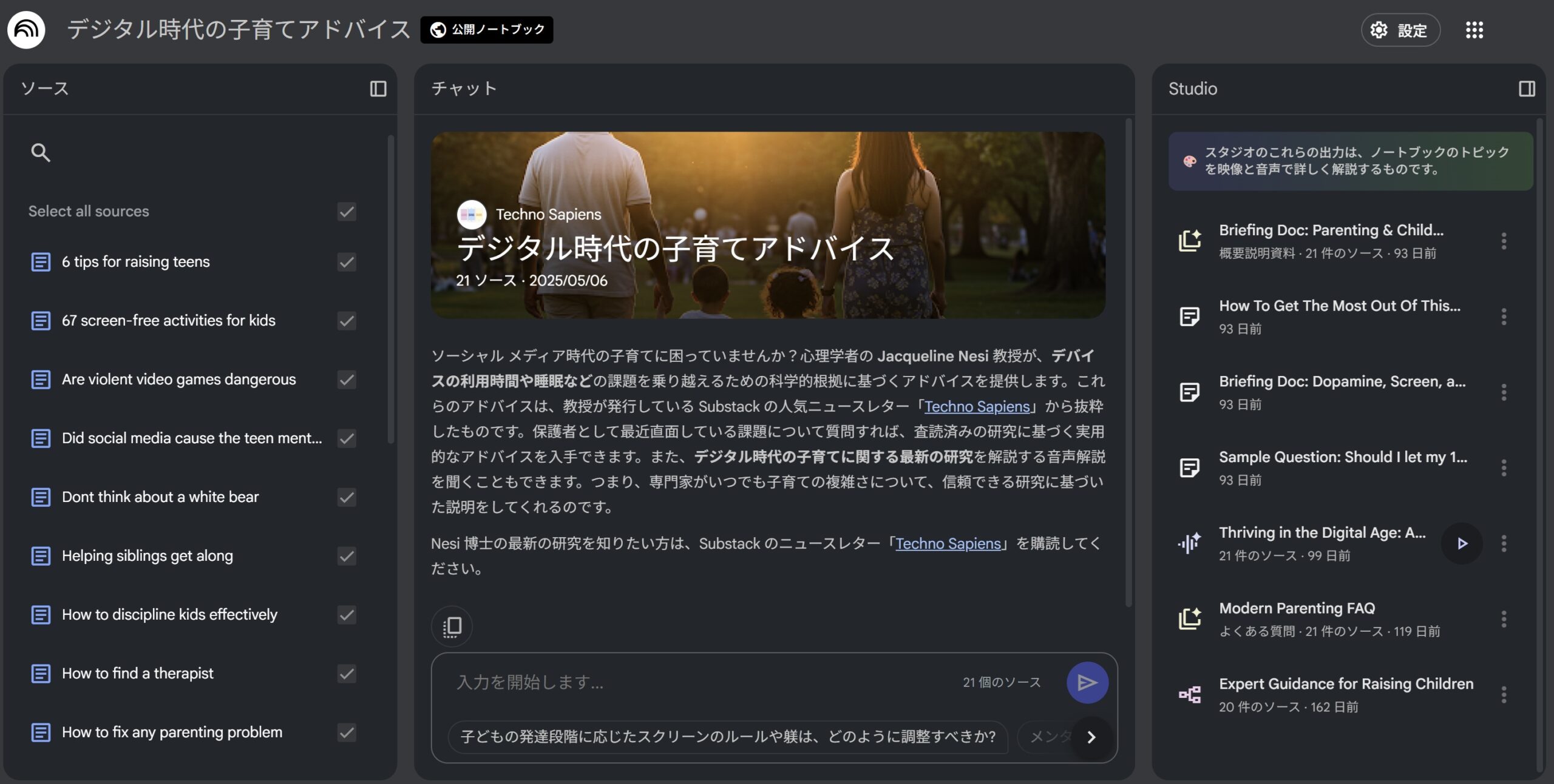 NotebookLMはChatGPTのように自由回答型ではなく、既存資料の整理・解釈・要約に特化しているため、創作的な“でっち上げ”をしにくい性質です。