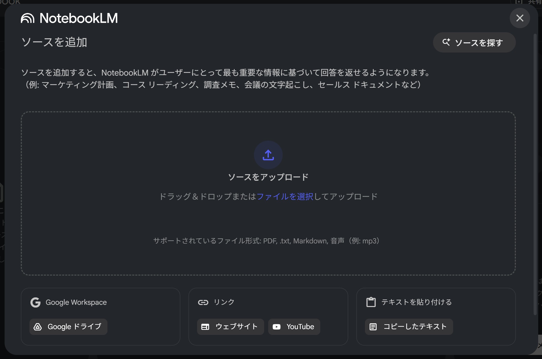 ノートブックにソースとなる資料を追加(アップロード)していきます。