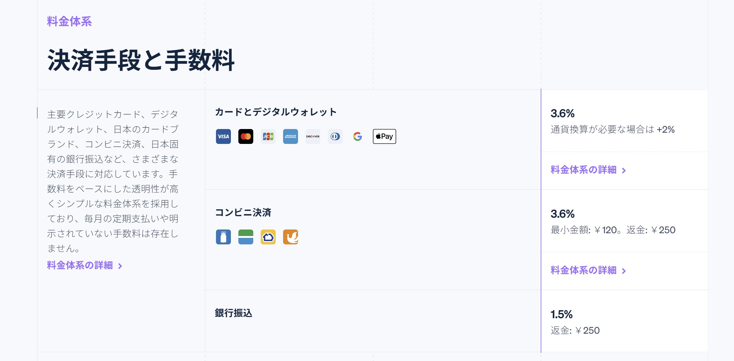 | 決済手段 | クレカ・Apple Pay・Google Pay・コンビニ・銀行振込・海外通貨 | クレカ・電子マネー(Suica等)・QR(PayPay等) |