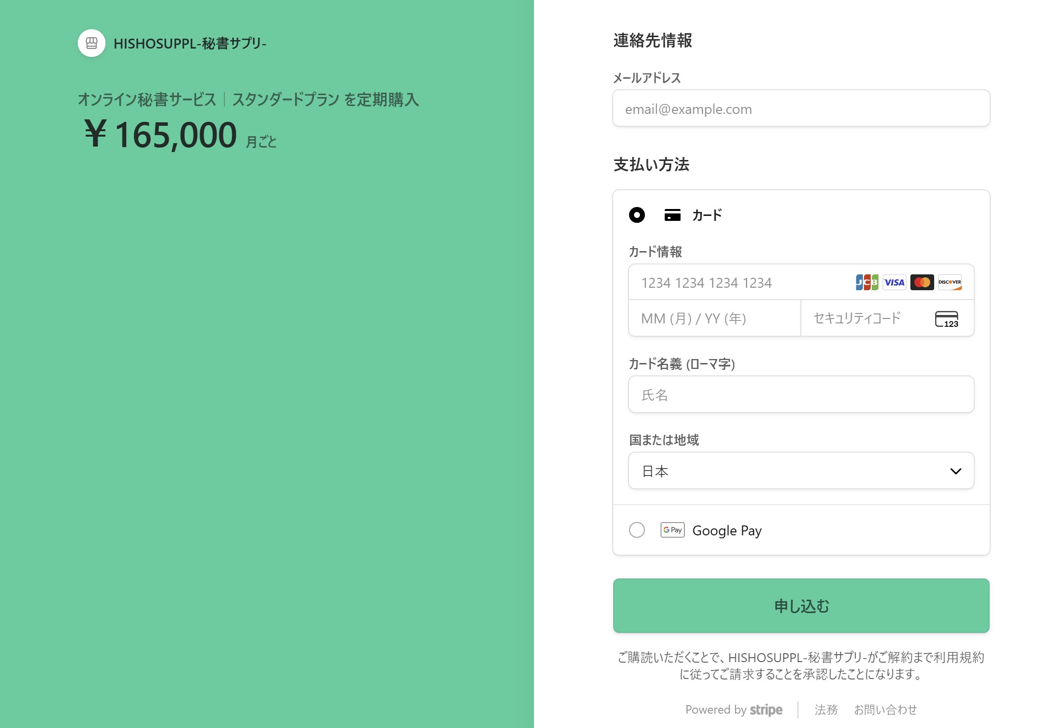 このURLにアクセスすると、下記のような決済画面が表示されます。