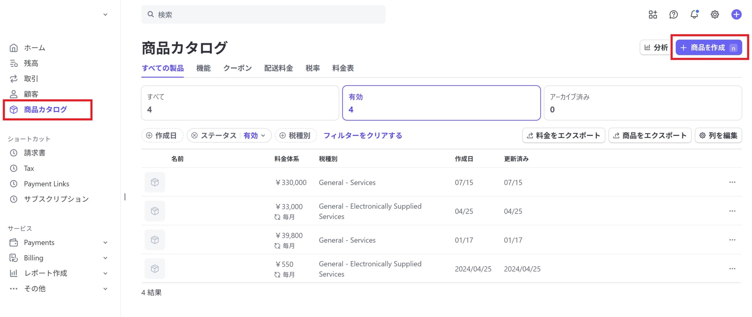 「商品カタログ」→ 「+ 商品を作成」