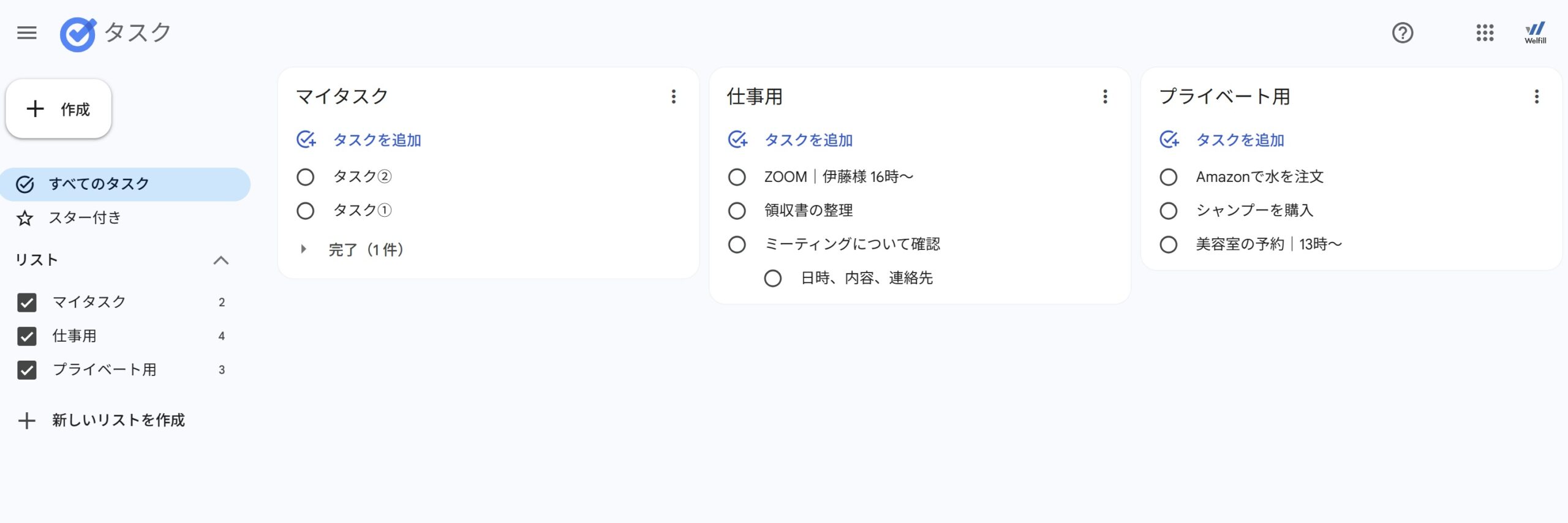 Googleが提供する「タスク管理アプリ」です。GmailやGoogleカレンダーと連携して、やること(タスク)を簡単に登録・管理できます。個人利用に向いており、シンプルな使い心地が特徴です。スマホアプリ(iOS / Android)や、ブラウザのサイドパネルからも利用できます。