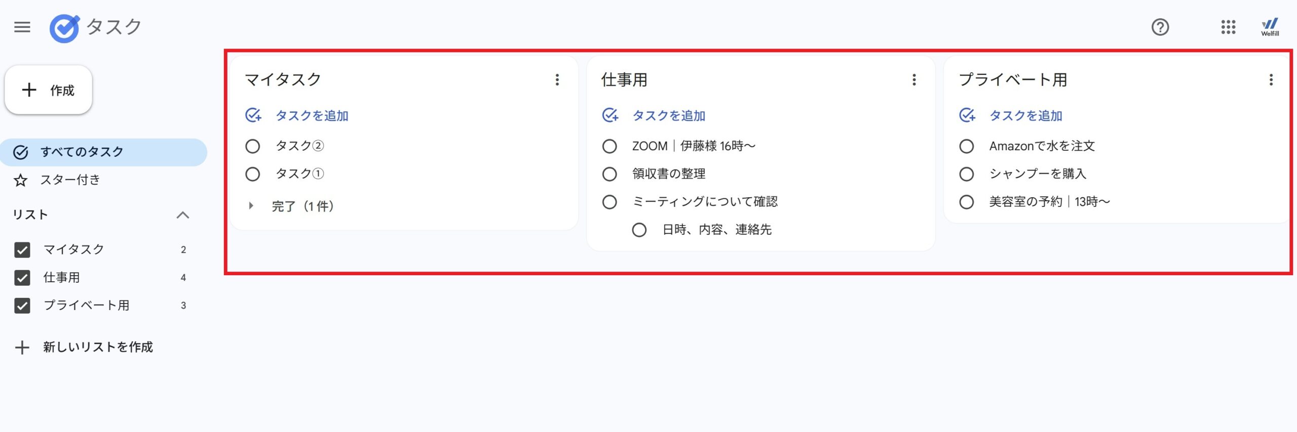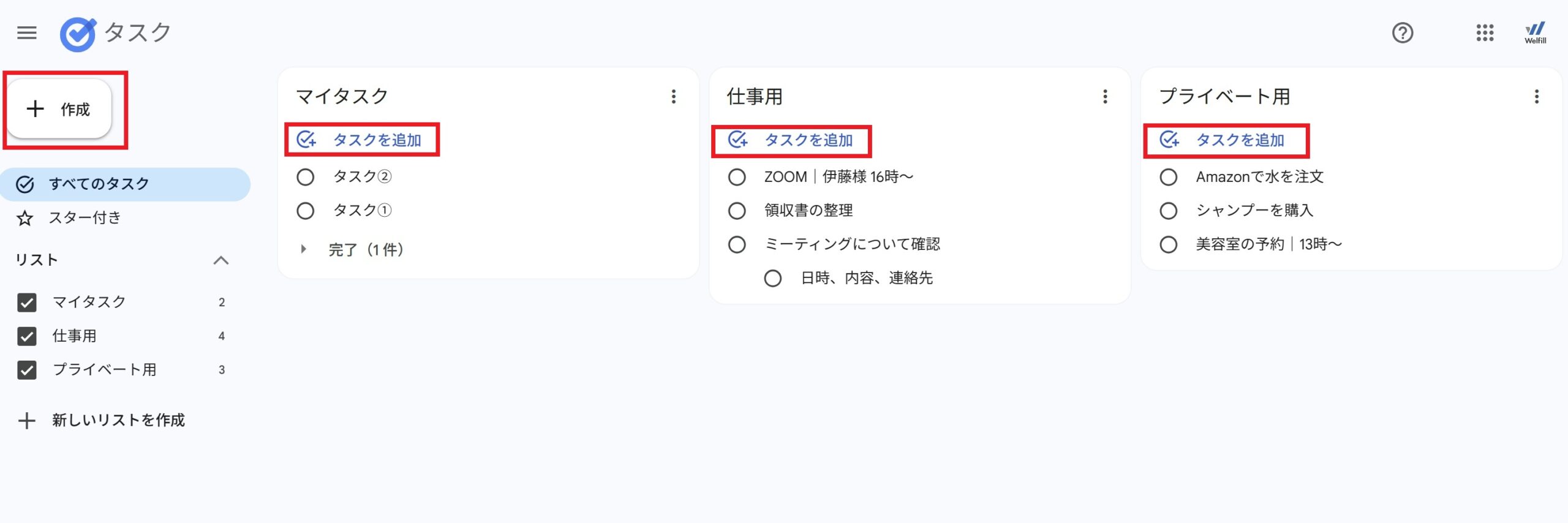 「新しいリストを作成」で、タスクを種類ごとに分けることも可能です。