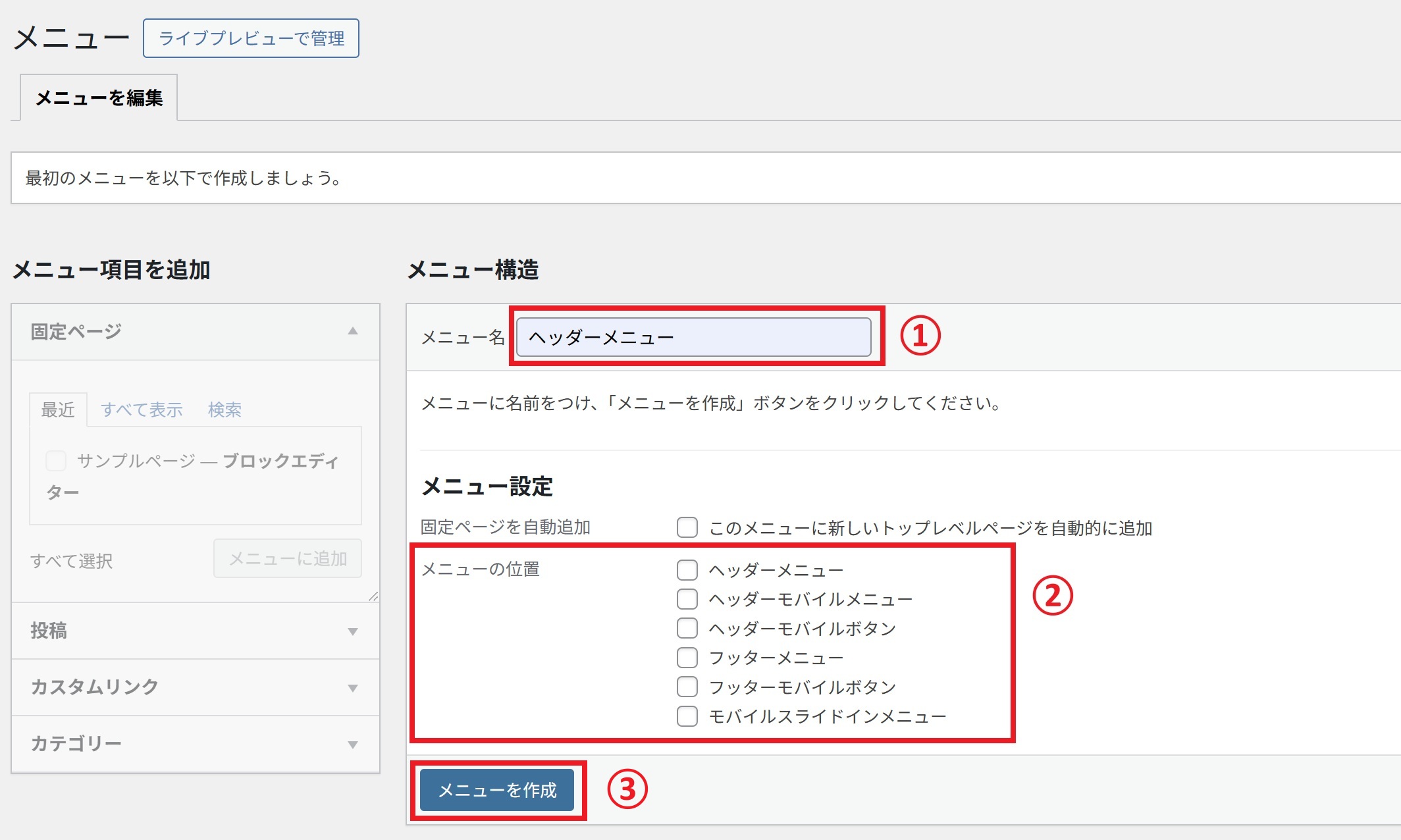 ①「メニュー名」を入力(例:ヘッダーメニュー)