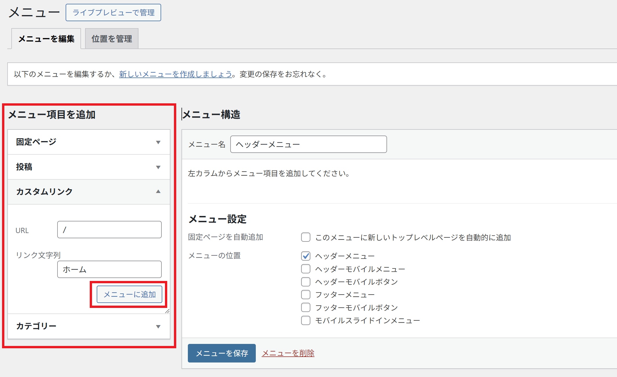 - ヘッダー用メニューを作成 ➡ 場所「ヘッダーメニュー」を選択