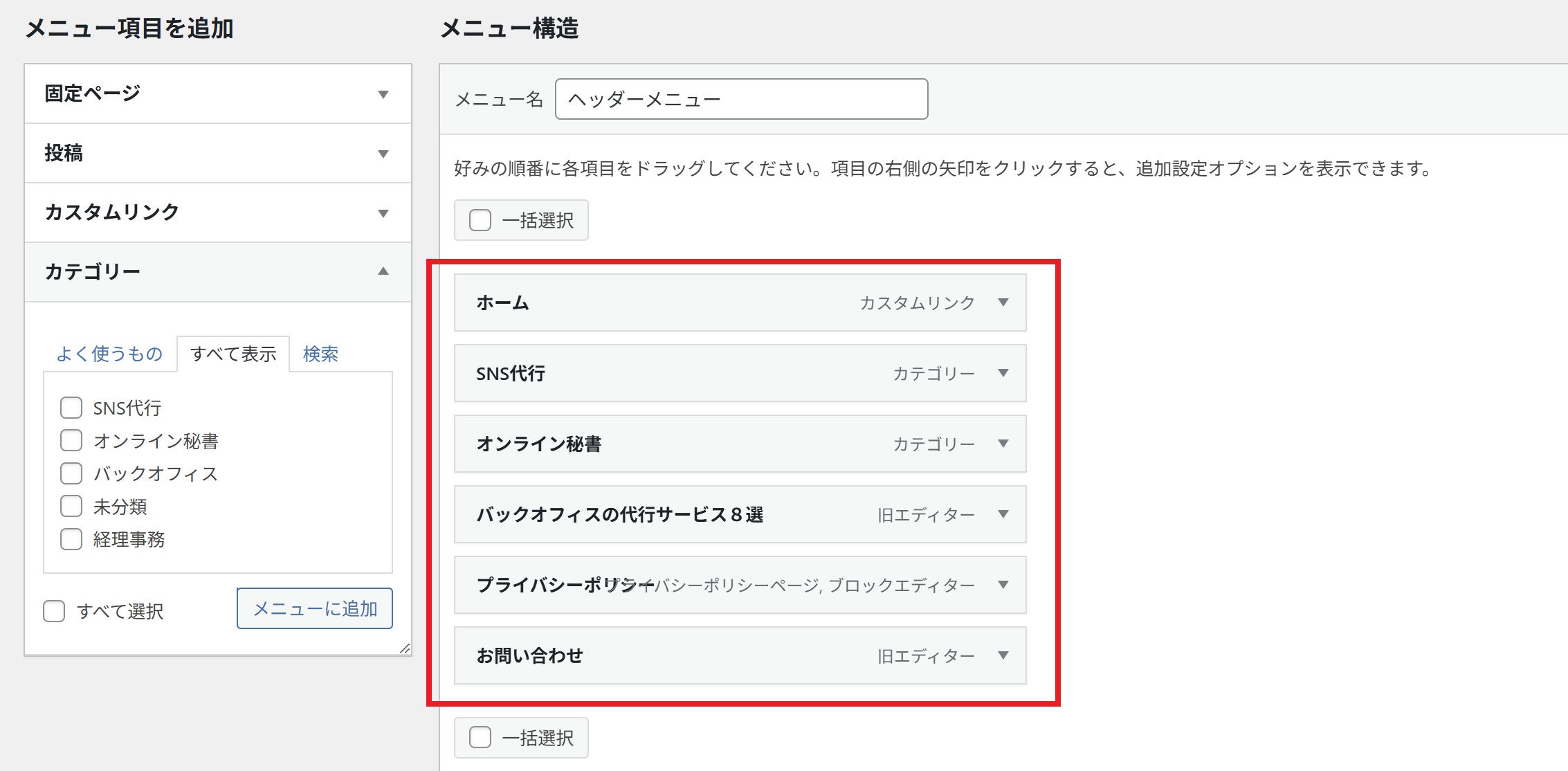 左側の項目から表示した「メニュー項目」を複数追加していきます。