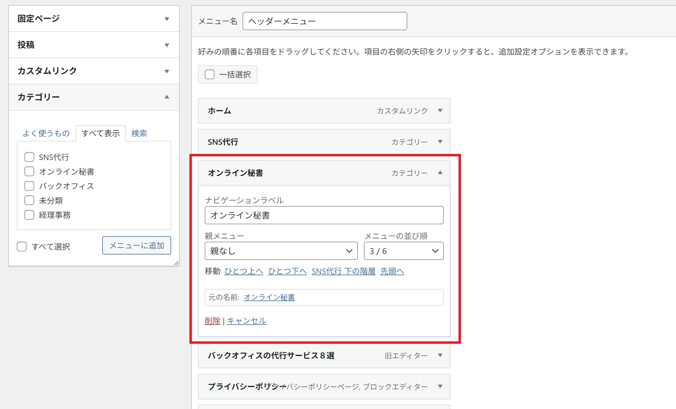 追加後、メニュー項目の「表示内容」を編集することも可能です。(表示名など)