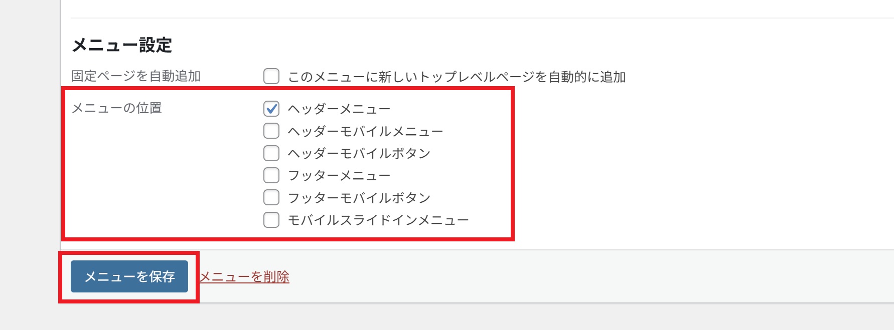 「メニュー設定」で作成したメニューを「表示する場所」を選びます。複数選択も可能で、選択した位置に作成したメニュー項目が表示されます。