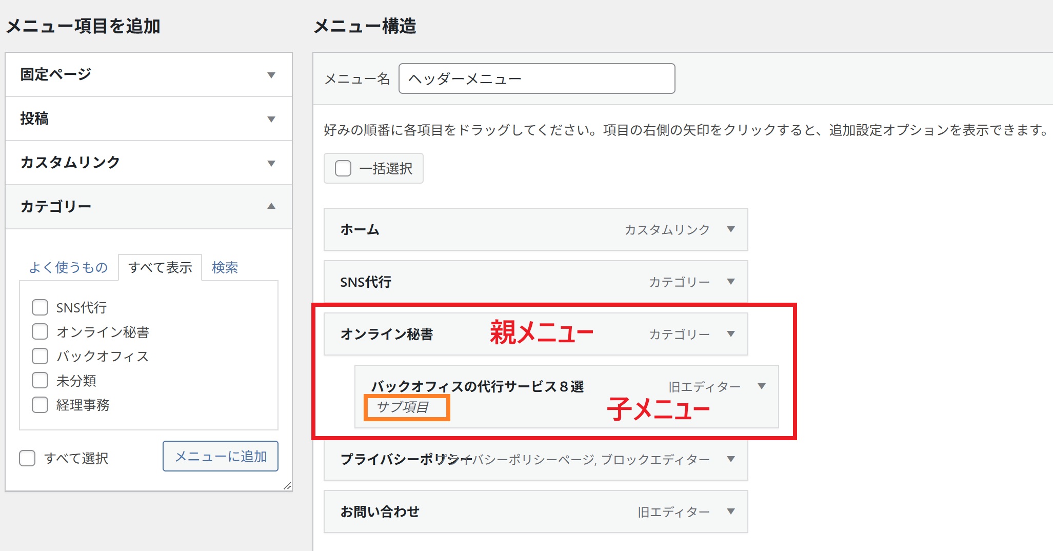 ①子メニューにしたい項目を、親メニューの少し右にドラッグ
