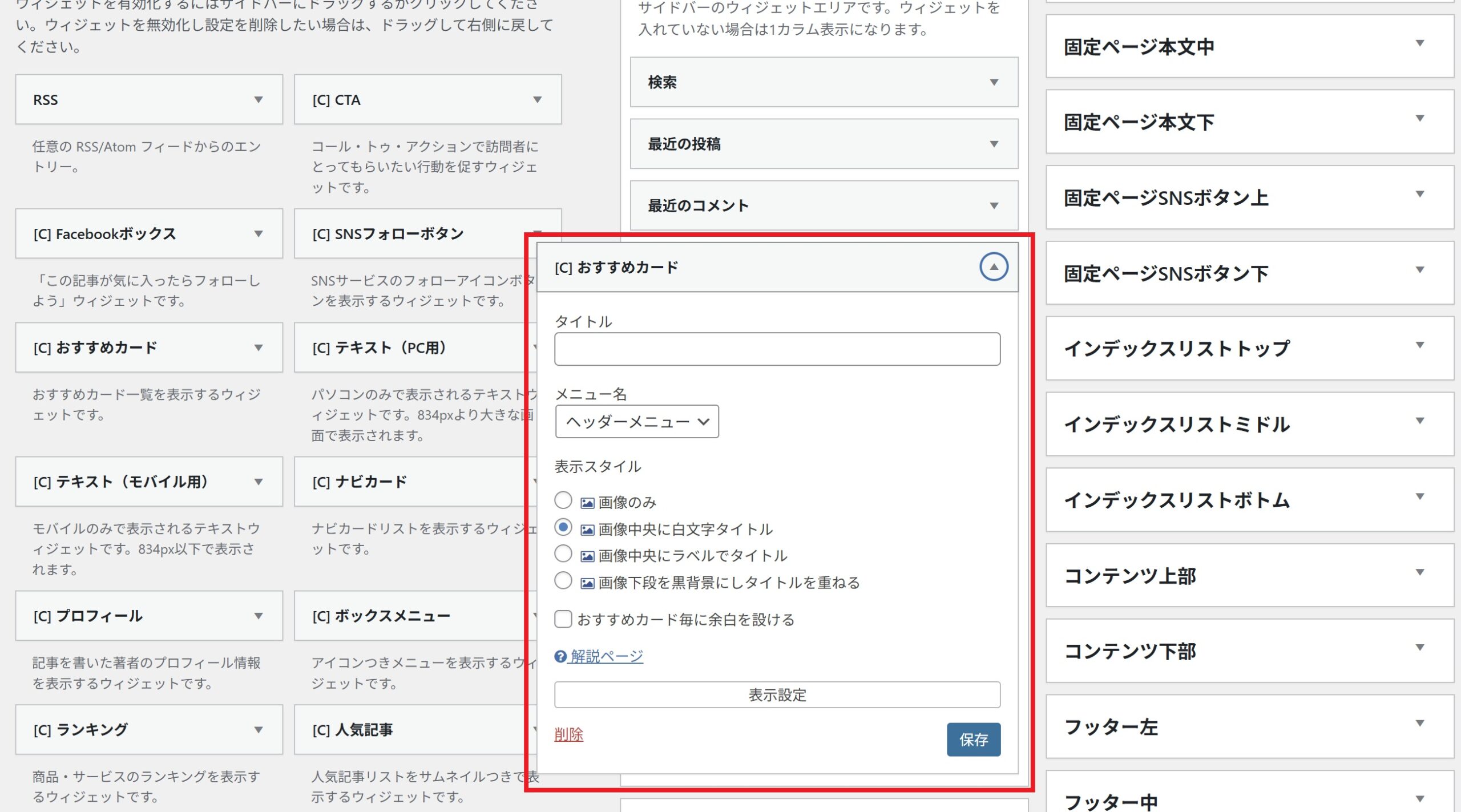 追加したウィジェットを開くと、ウィジェットの編集が可能です。タイトルなどを入力して保存してください。
