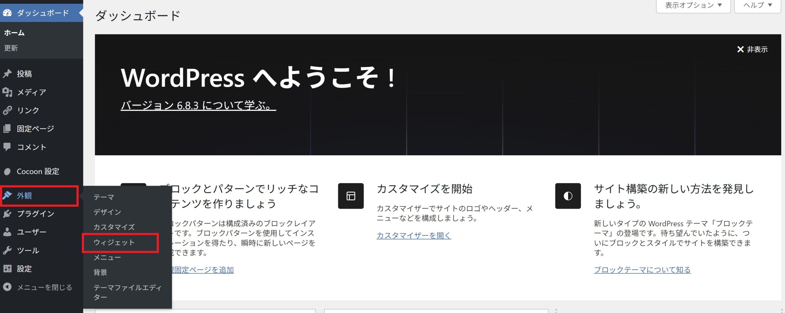 【外観】→【ウィジェット】をクリックします。