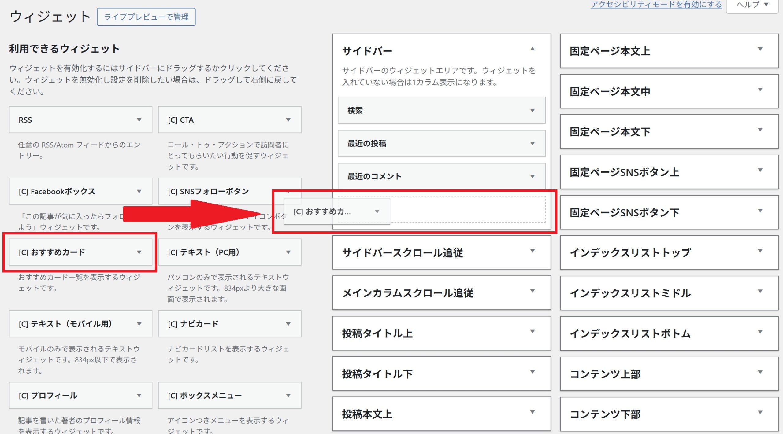 左側にある「利用できるウィジェット」から、追加したウィジェットを、表示したい場所にドラック&ドロップしてください。