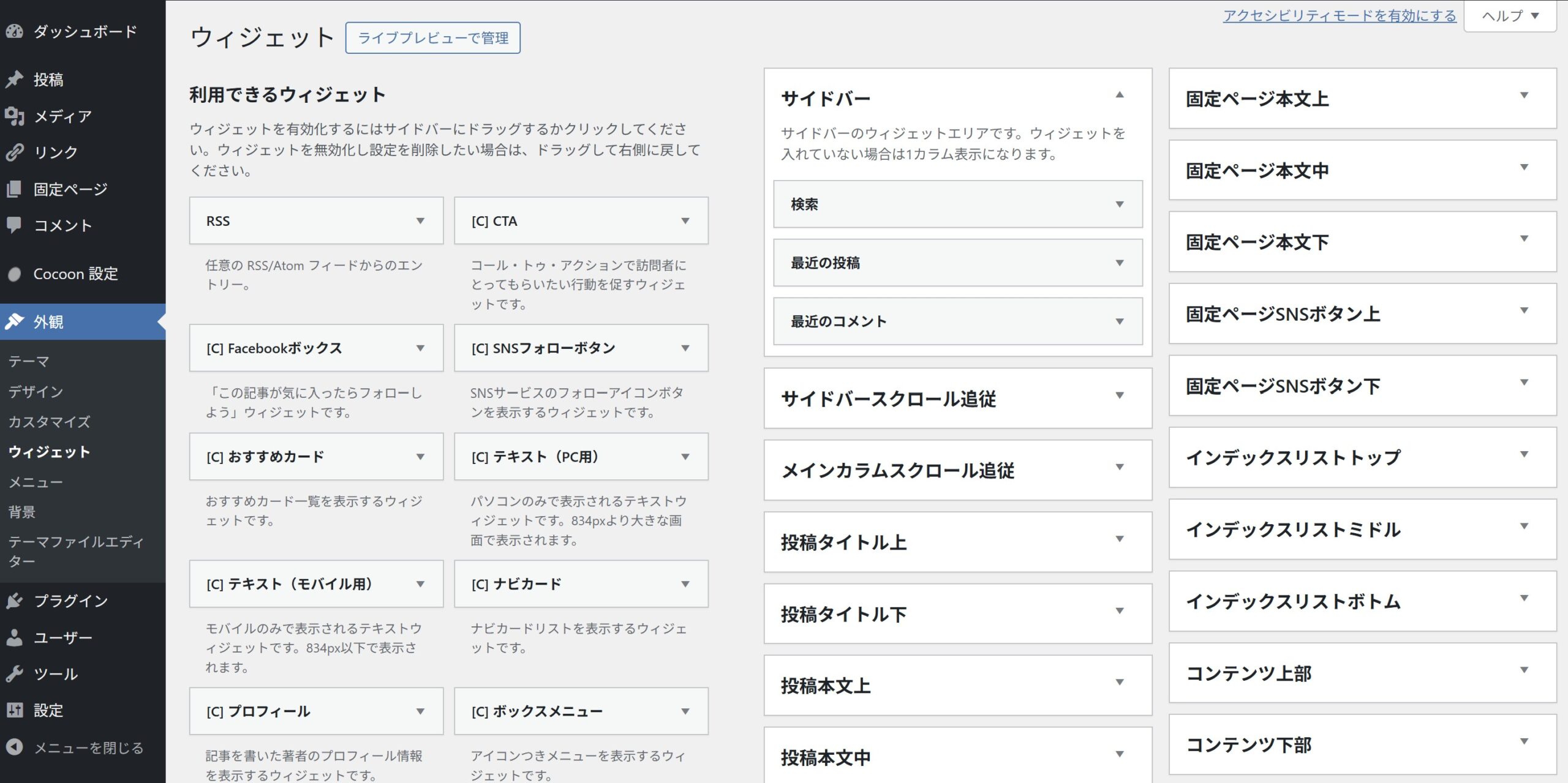 ※テーマによっては [外観] → [カスタマイズ] → [ウィジェット] で編集する形式もあります。